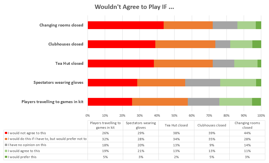 The headline figures show that 44% of respondents to the survey would not agree to football coming back if it meant changing rooms had to be closed. For players in particular, the prospect of playing without changing facilities was something that half (50%) of those completing the survey were not prepared to do, whilst the number of managers not prepared to return without changing rooms was 61%. The inevitable consequence of playing without changing rooms would mean that players would need to travel to games in kit, something that 26% of respondents didn’t consider viable, rising to 35% amongst players.